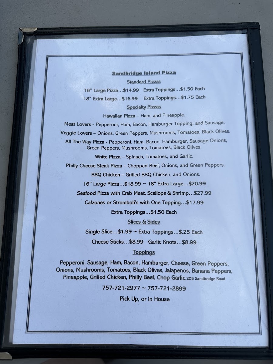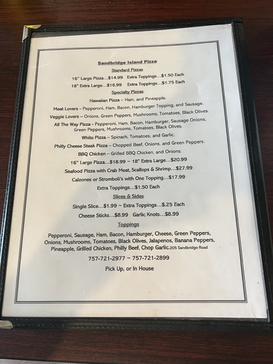 Welcome to Sandbridge Island Restaurant, nestled in the picturesque locale of Virginia Beach. This gem offers a vibrant menu that perfectly captures the essence of beachside dining. Guests rave about a variety of dishes, but the standout has to be their pizza, renowned as one of the best on the East Coast, rivaling even NYC's finest. The atmosphere is laid-back yet inviting, with ocean views enhancing your dining experience.